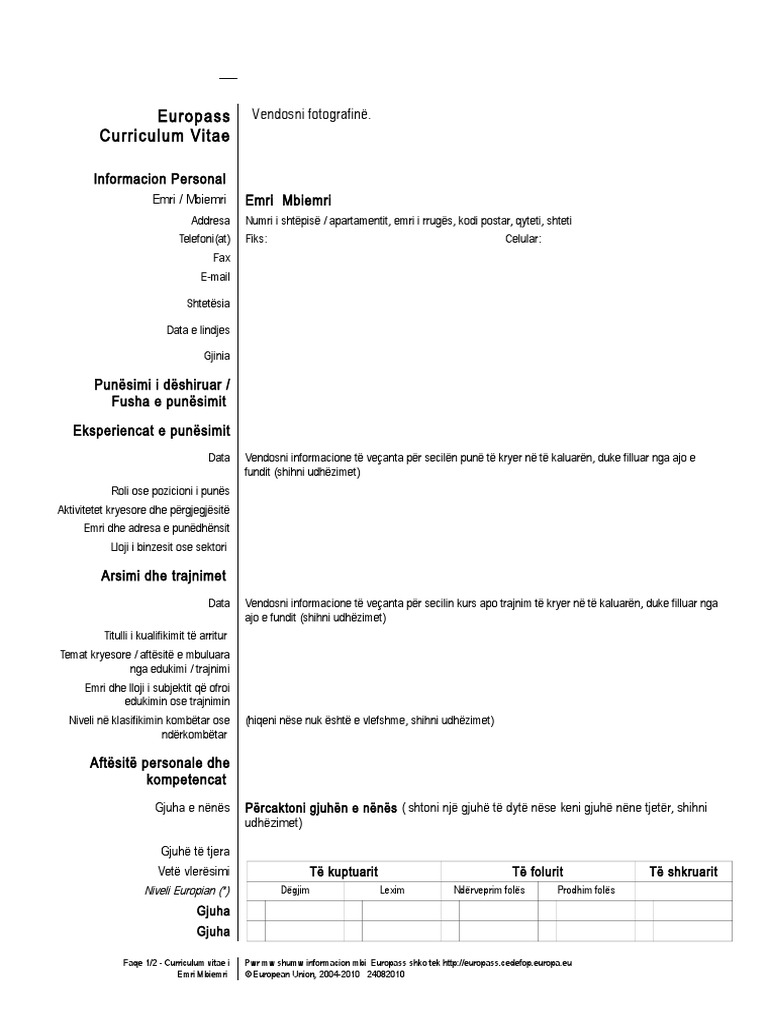 1240 x 1240 pixels (110006 bytes) image name: Si te perpiloj nje cv fjalaime. 2818 x 2818 pixels (521765 bytes) Europass curriculum vitae cv shqip shkarko cv shkarko cv shqip. Shkarko cv shqip europass / cv curriculum vitae shqip. Curriculum vitae shqip download as word doc doc pdf file pdf text file. 75% (48) 75% found this document useful (48 votes) 16k views 2 pages. Check spelling or type a new query. Platforma është shume e përdorueshme edhe për punëdhënësit ku ata mund të shpallin konkurset për vëndet e lira të. Cv shqip, shkarko cv, shkarko cv shqip. Europass curriculum vitae informatat personale mbiemri / emri numri personal i id: The europass cv makes your education, work experience and skills transparent internationally. Esistono tanti modi per realizzare il proprio curriculum;